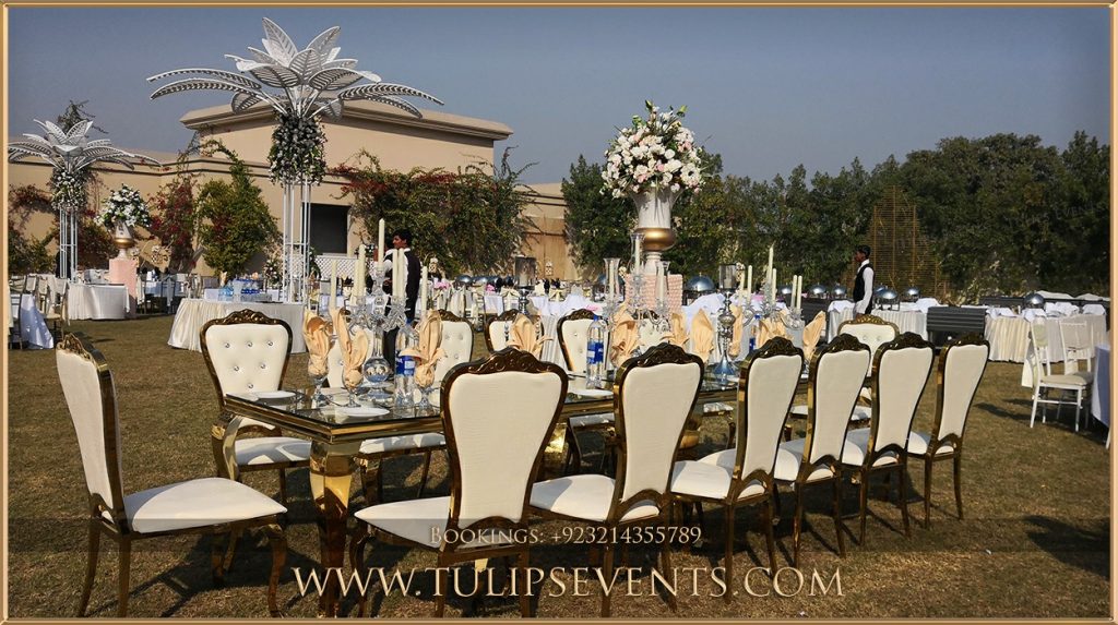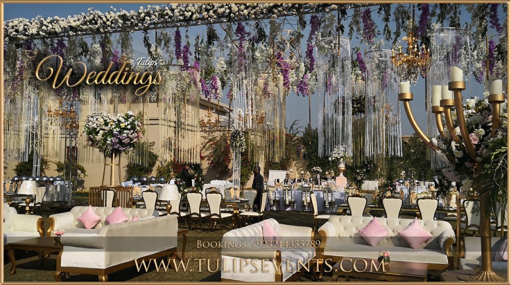 Creative head table decorations with exclusive crystal chairs and glass dinner tables. Which makes your vip guests more wow factor. Nevertheless the other sitting plan includes one of the best wedding lounges and sofa sets in Pakistan. Golden wooden structured sofa with white velvet tufted setup.