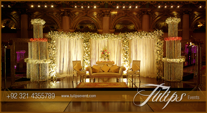 Find the Best contemporary stage design by Tulips Events in Pakistan, exclusive crystal decor, table arrangements, walkway design along beautiful entrance