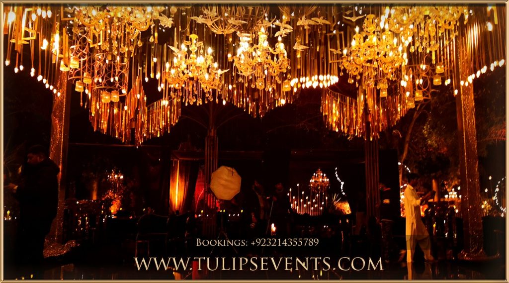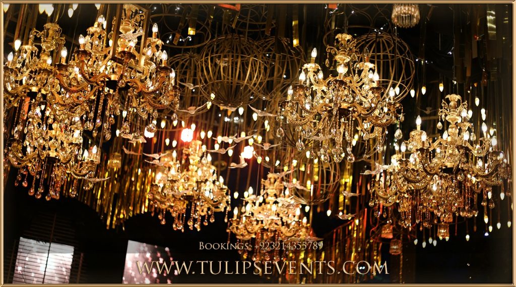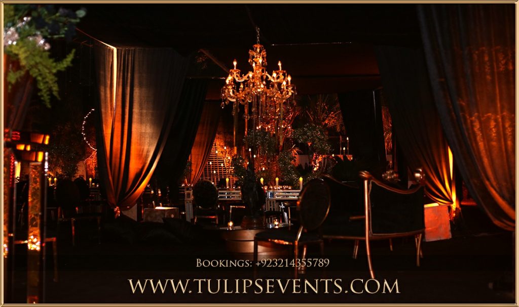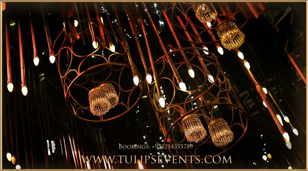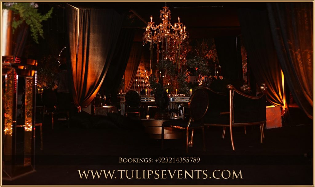 You can find everything black and gold especially the roof decoration which is made from the hanging chandeliers. rod iron golden perks, hanging golden bulbs, creative golden floral drapes, and more.