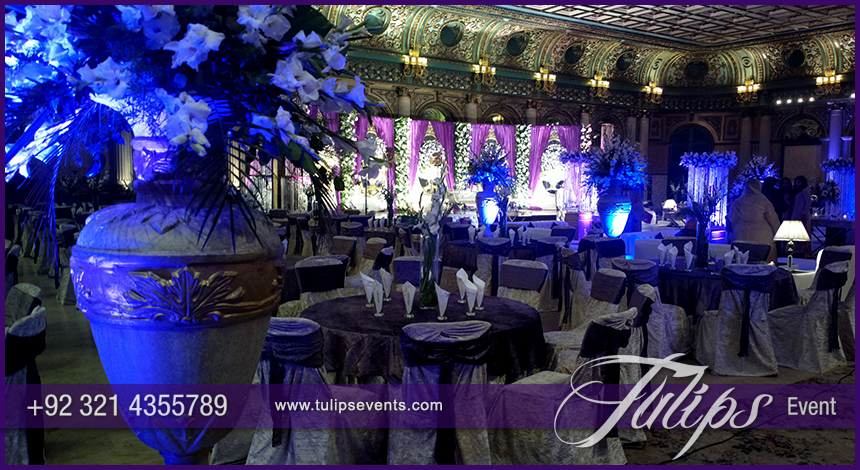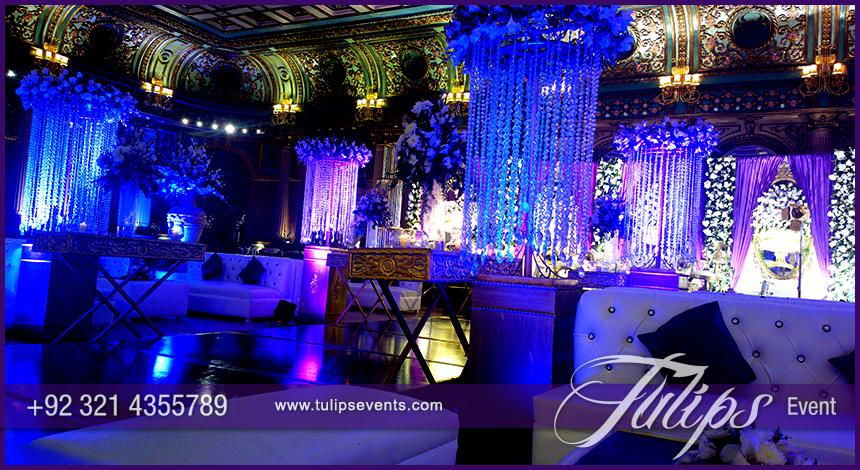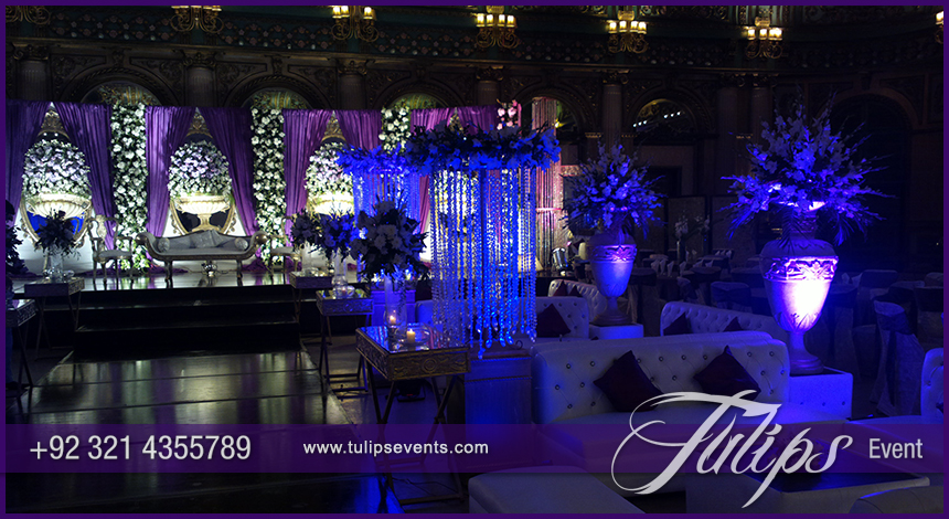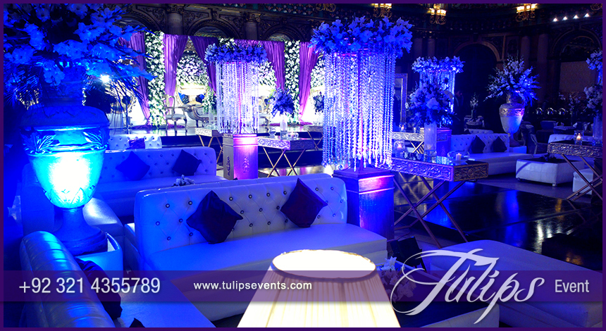 A wooden walkway along stage with console table decoration on each side of ramp. Standing cocktail tables with floral pots with astonished blue ambiance lights. Its quite rare ambiance for Plum Walima Stage Setup and blue lights walima events in Pakistan. But client always has own choice to make his/her event according to his/her plans and wishes.