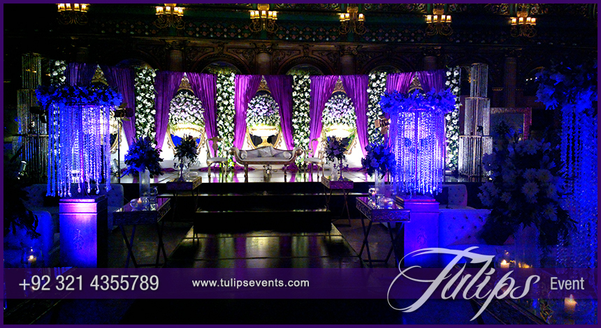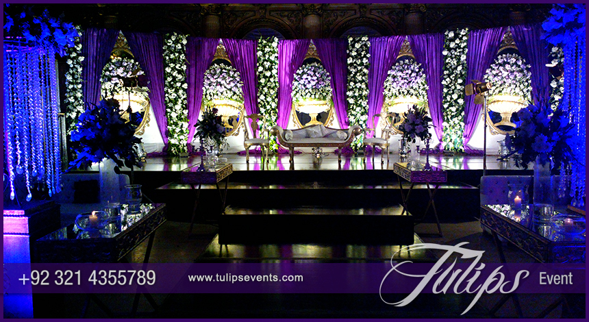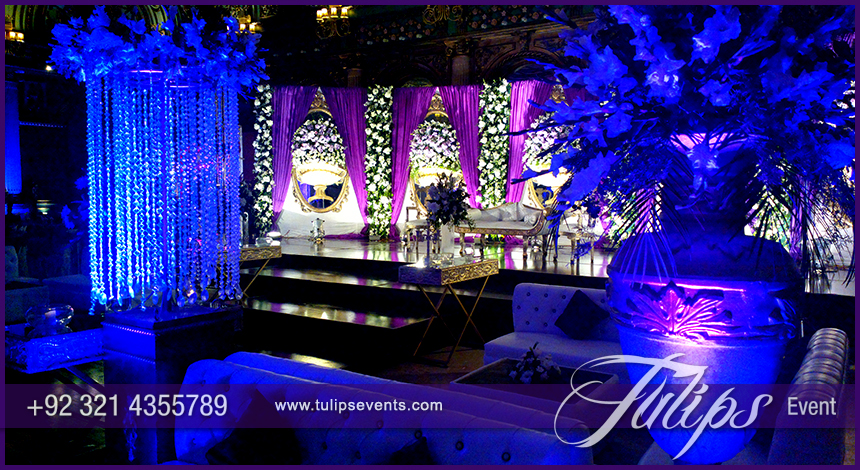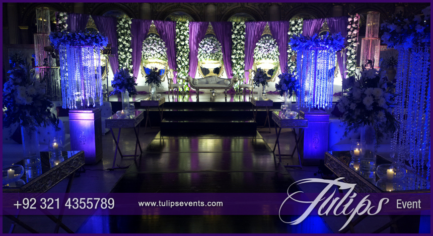 Color makes our wedding more themed & attractive. It varies from client taste that what he/she think his/her special day in perfect ambiance and glorious event. Tulips brings you this setup in blue & plum walima stage setup design ideas in Pakistan.
