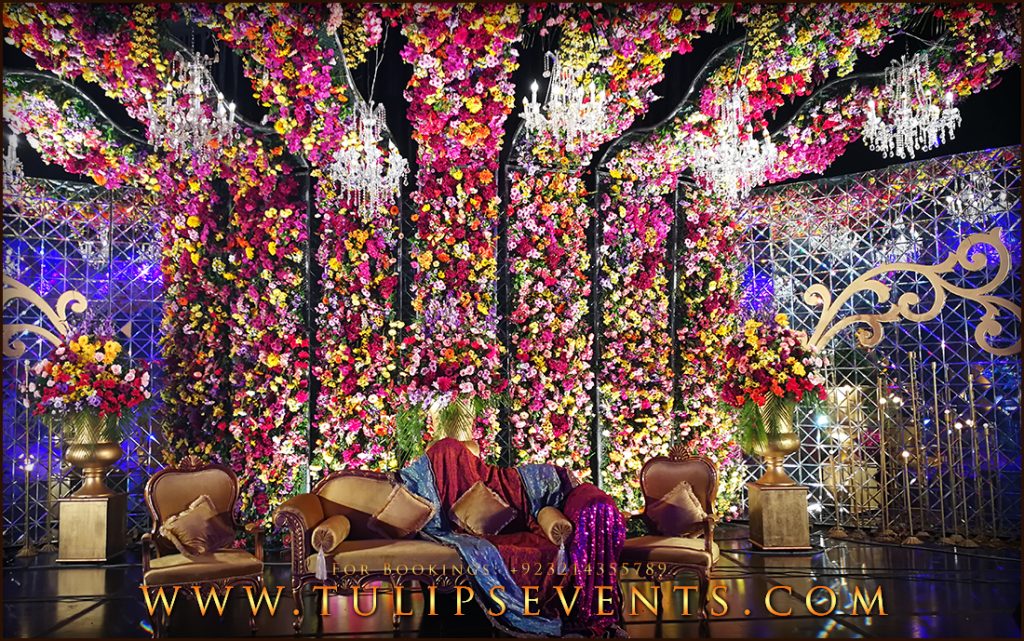 The main giant of the event is the stage that contains almost seven big pillars with draping cuts. These lines contains plum floral work with hanging chandeliers.