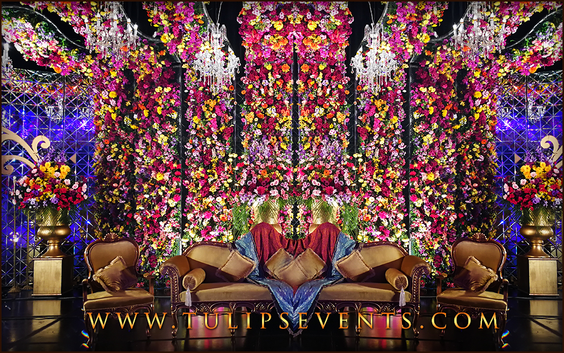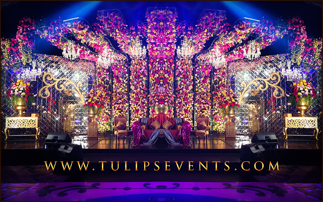 The main giant of the event is the stage that contains almost seven big pillars with draping cuts. These lines contains plum floral work with hanging chandeliers.