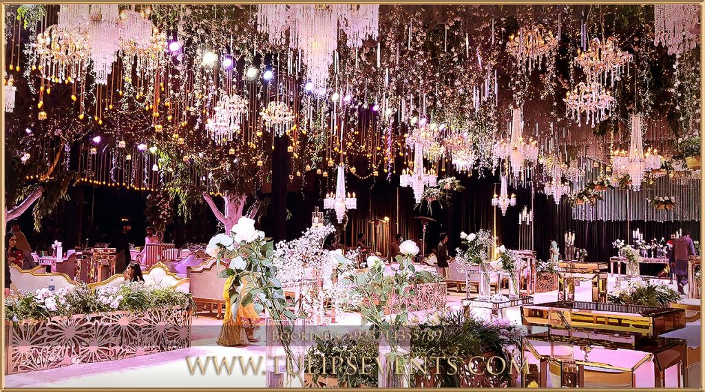 The stage floral stairs along with white floral mountains give an extravaganza look and feel for all guests. Explore our latest wedding decorations elements in Enchanted Forest Wedding Decor perks.