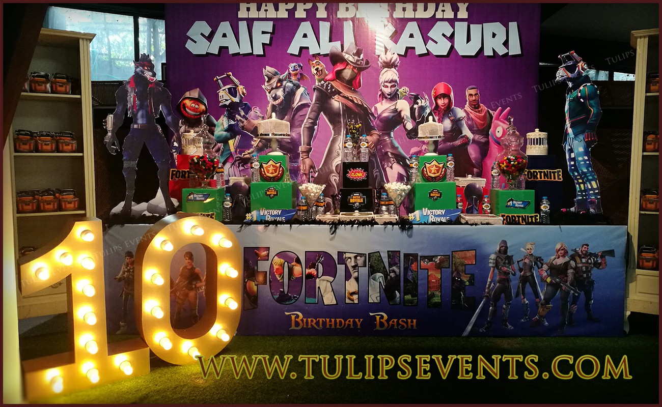 You’ll find perfect decoration covered with all our Fortnite Birthday Party ideas! Saif Ali Kasoori loves the game and wanted a Fortnite theme party at his home backyard. Tulips creative team started to get his inspirations according to the desire theme and made fantastic arrangements at all.