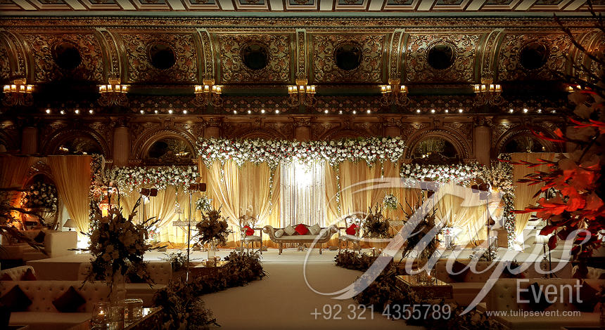 Tulips Events offer highly professional wedding planning and management services at Lahore, Islamabad, Gujarat, Sialkot and almost all Pakistan. Grand Walima Stage Decor at our best level of wedding event management services that is starting from invitation card selection, invitation card design, gift packing, beatification, stage decoration, theme decoration, floral decoration, car decoration, wedding decoration, professional wedding photography, professional video graph, sounds coordination, lighting coordination to catering services.