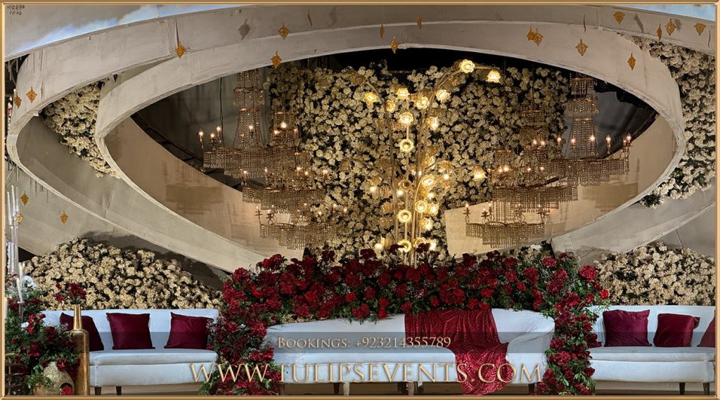 When it comes to Pakistani weddings, the Baraat is the most celebrated event. In 2025, the trend of luxury Baraat decoration is all about red & maroon floral themes, royal stage backdrops, and grand entrances.