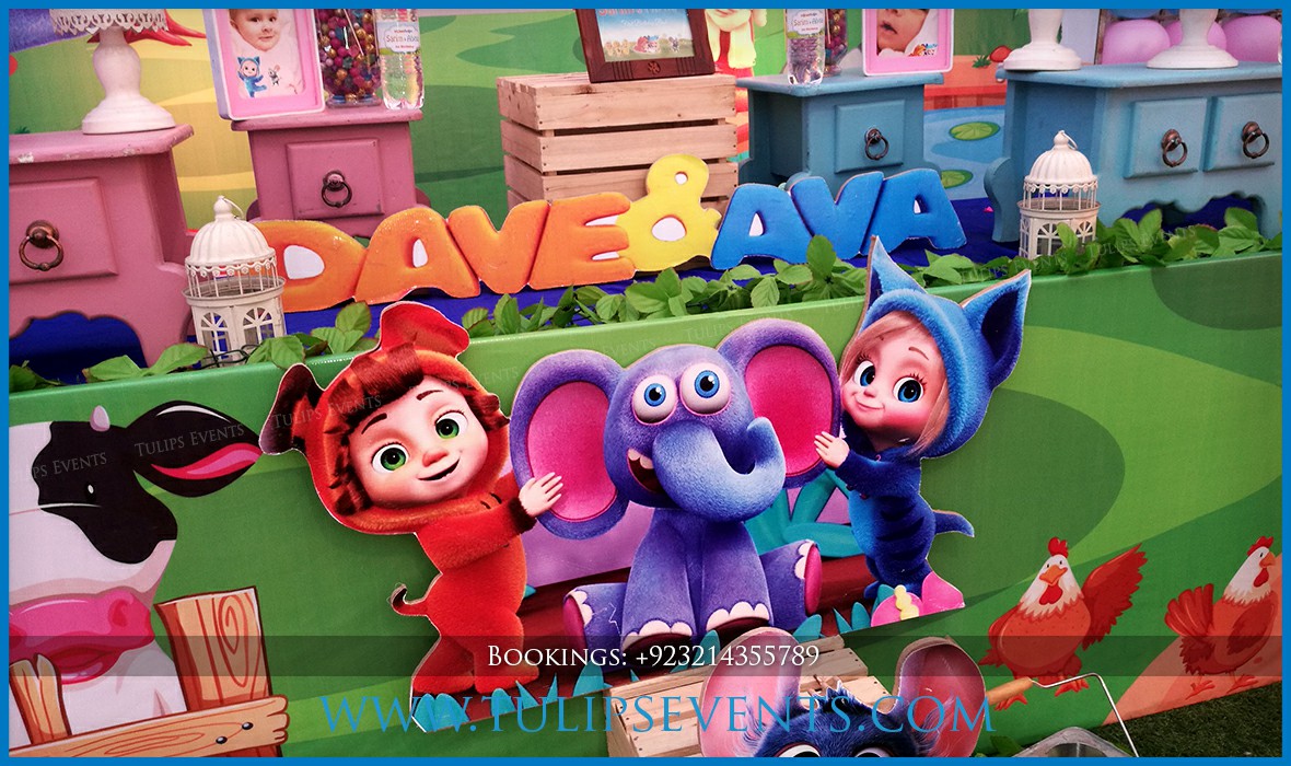 Few favorite character like Dave, Ava and Horse, Hen, Ducks, Caw along with green leafs tree and old farm house setup ideas.