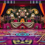 Find the vibrant shooking pink and purple combinations with green and orange elements. Green grass backdrop along with eye catching decorative elements gives extravaganza look and feel to the guests. Same as the Rangoli dance floor with pattren that’s actually called “Rangoli”.