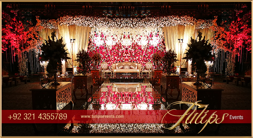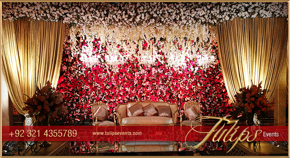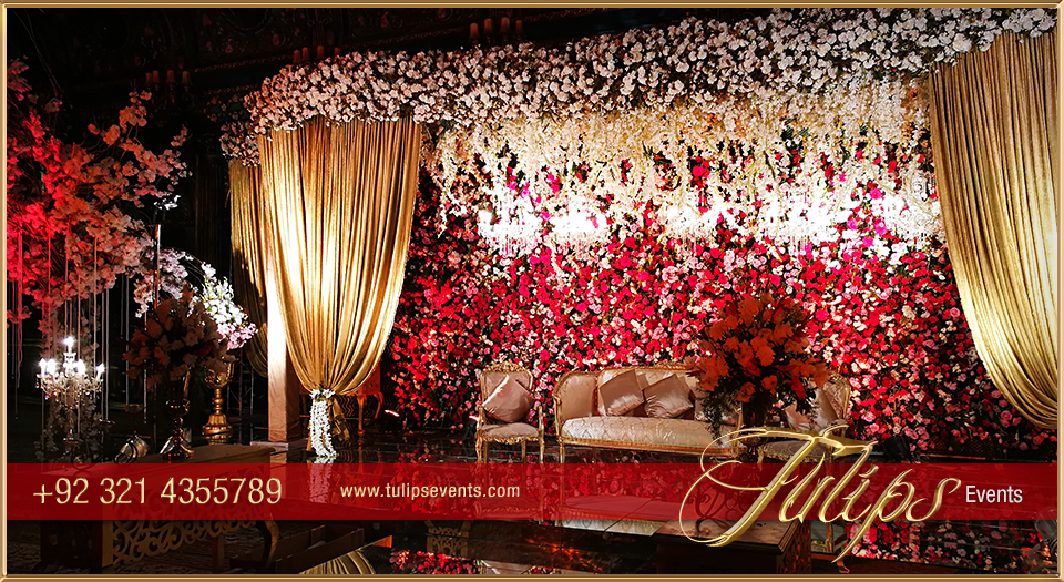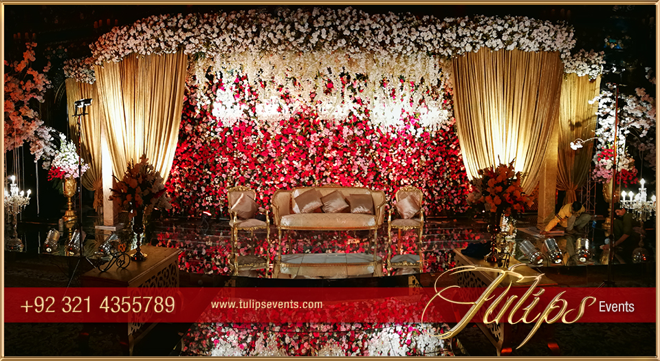 Are you still planning to throw the perfect wedding decoration in Lahore Pakistan ? try our fantastic Red Gold Baraat Stage Floral Backdrop ideas in Pakistan.