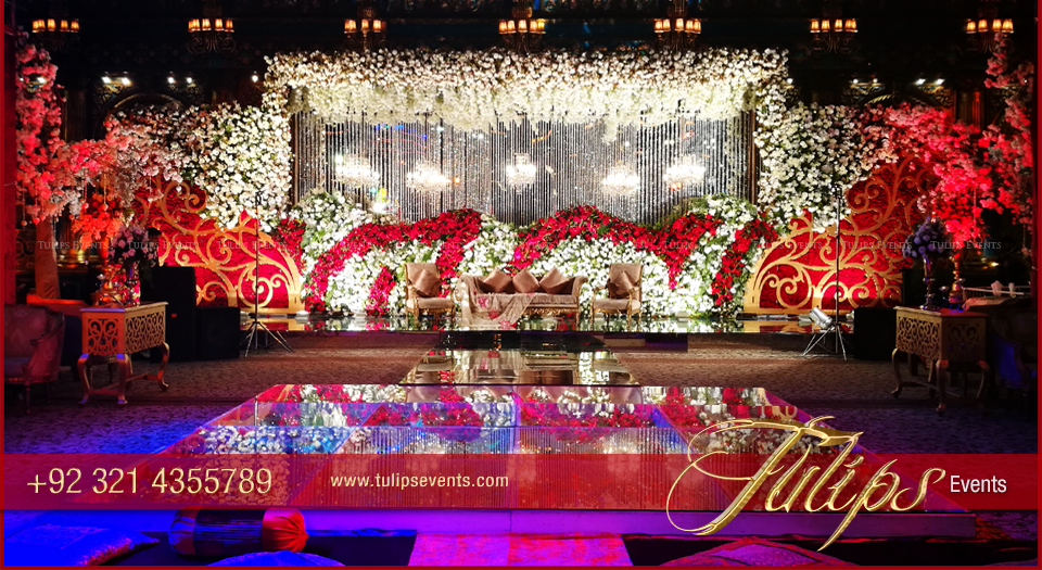 You’ll find red and white floral arrangements with amber gold theme lights which makes event more energetic and eye-catching. The new trends with glass looking mirror floor plans gives extraordinary look to the stage to entrance. Then again the transparent back-light glass dance floor along with effect lights trussing on both sides of the setups.