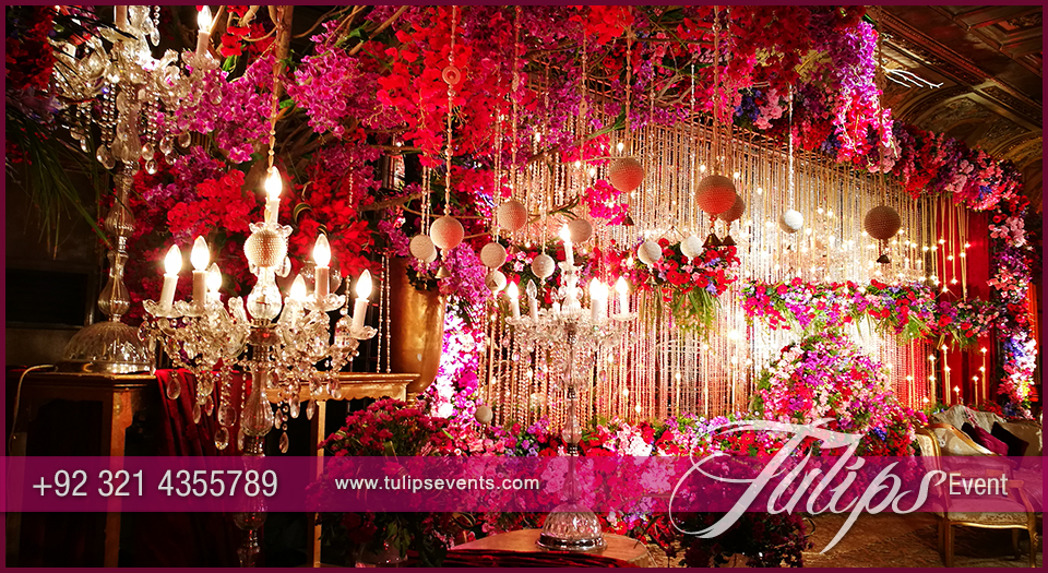 Find the beautiful hanging bulbs along with dark and vibrant colors floral arrangements. Red accent color implement in consoles tables with floral vases, vine glass decorations, standing chandeliers and candle operas.