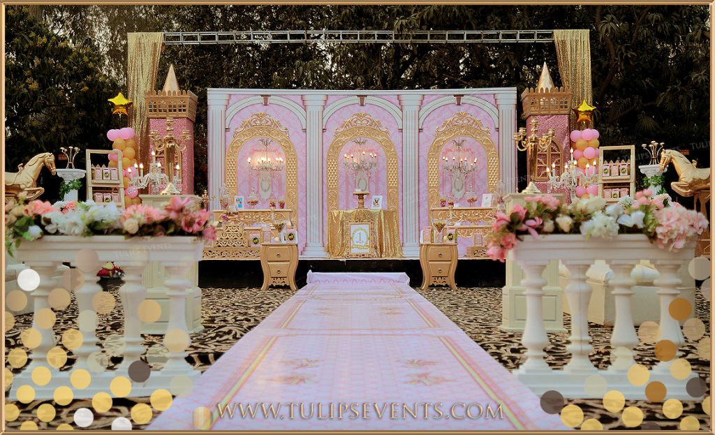 Pink is always loving color for the baby girls and their special day’s like birthdays, baby shower etc and if you add gold color its becomes something royal with enchantments perks. We gives you fresh concept to the creative royal arched backdrop along with hanging chandeliers and roman style royal golden arches.
