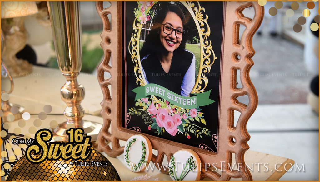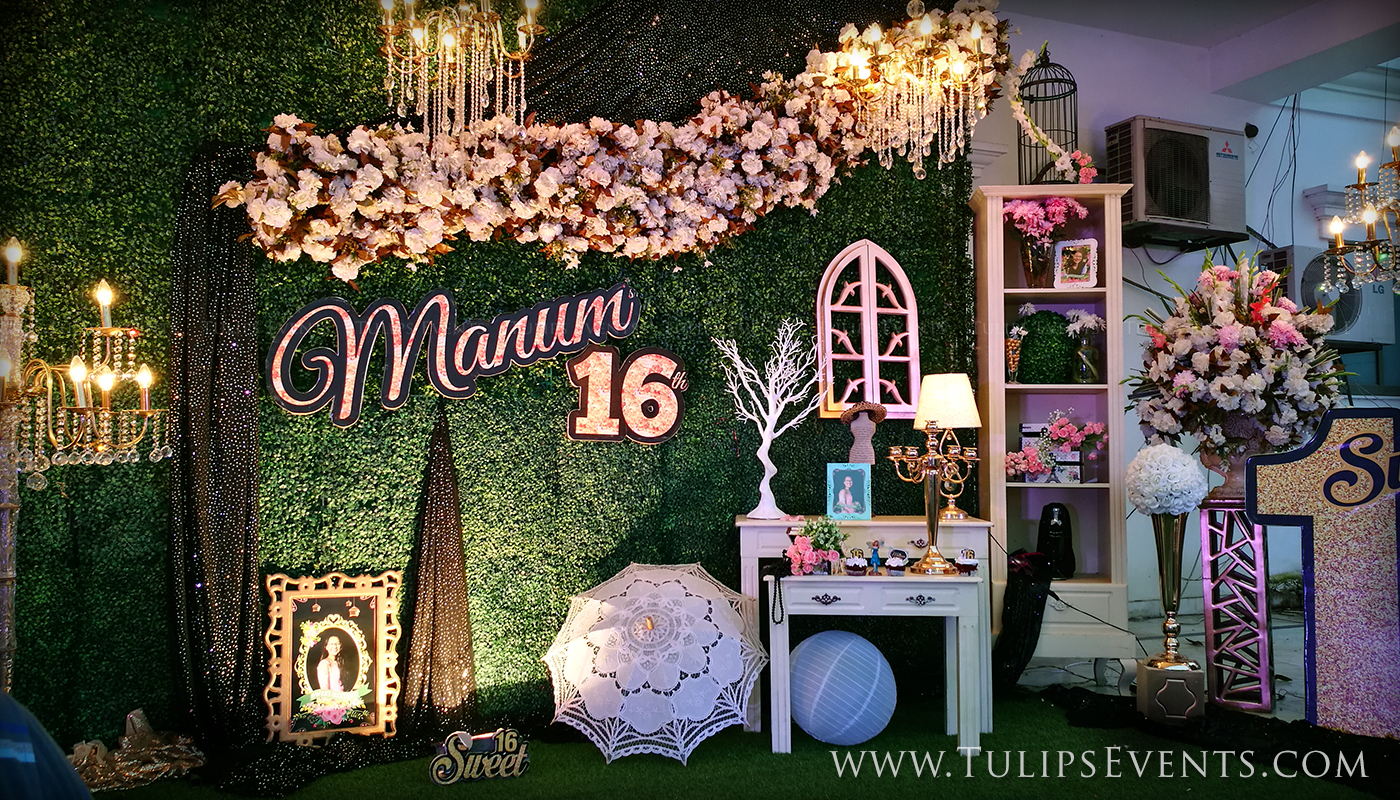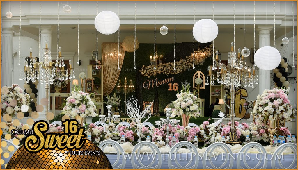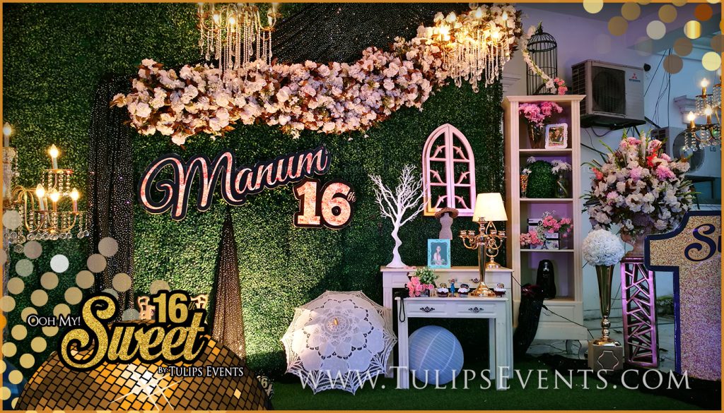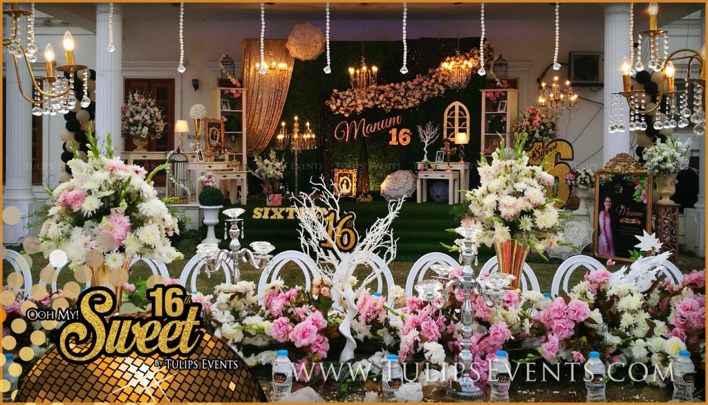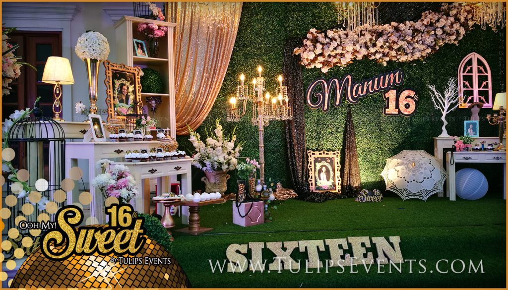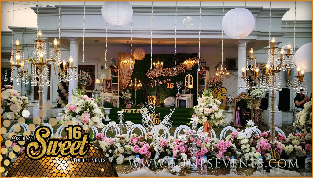 The major color theme is green inspired from the nature / garden at all, then we add some accent color as gold that can be as perfect as best in arrangements. Such like hanging chandeliers, standing chandeliers, pic frames, cupcake topper and backdrop customized name “Manum Sweet 16th”
