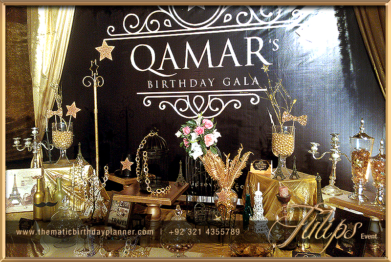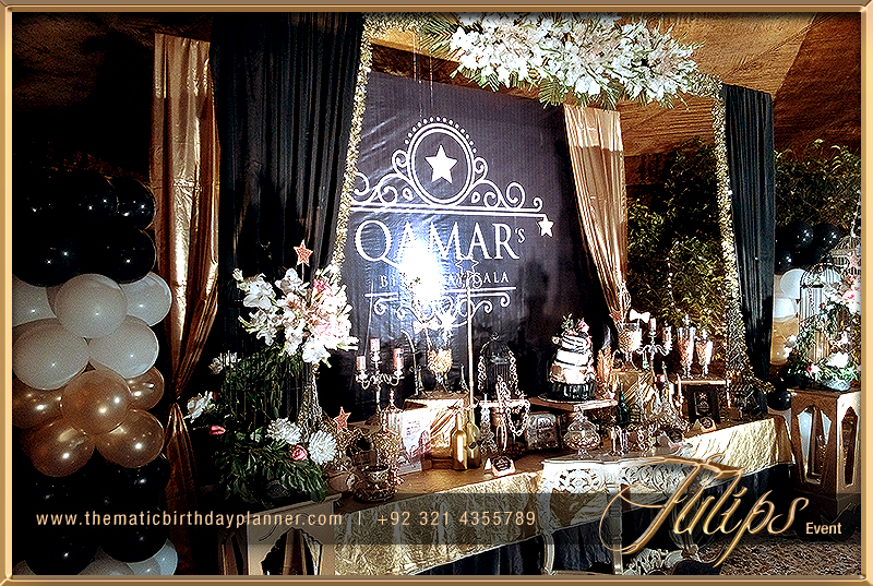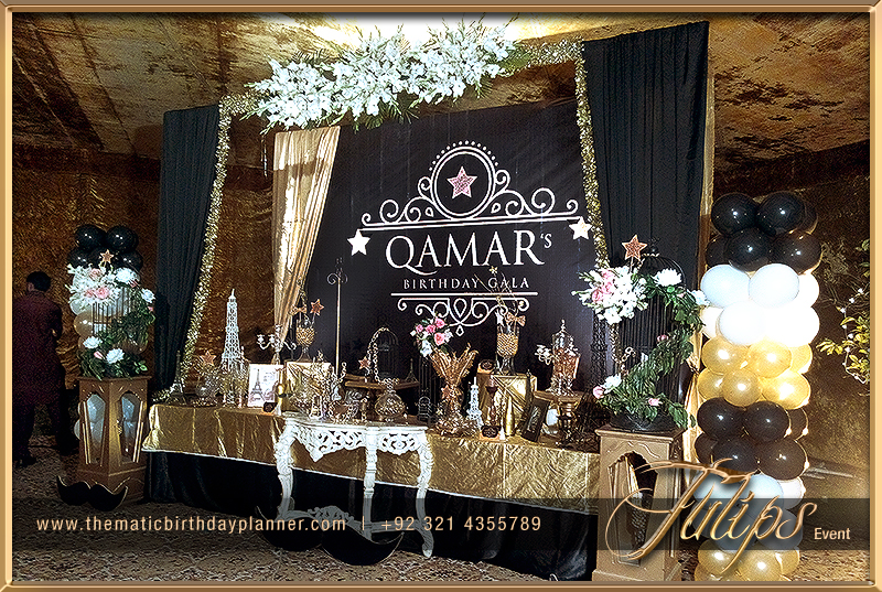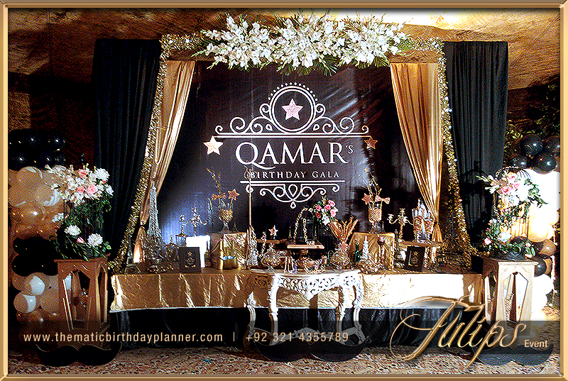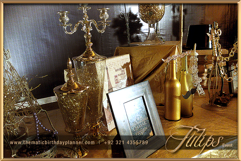 There is lot of ideas for theme your event, either it can be red & Black, Gold & Black or something light color for the day events. You’ll find the gold & black 50th wedding anniversary theme photos in this album. The main table having props with gold and black color, creative crystal jars along with labels, floral bunch at top and golden fabric draping in stylish techniques.