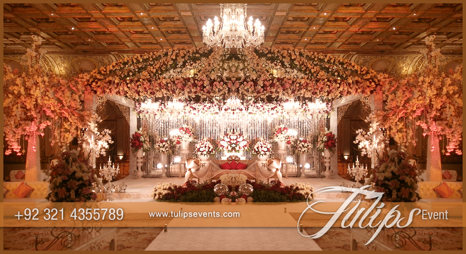 White is the most common color in our event and its appearance with other colors makes perfect themed events in Pakistan. Such as we brings White Garden Walima stage decoration setup ideas and floral arrangements.