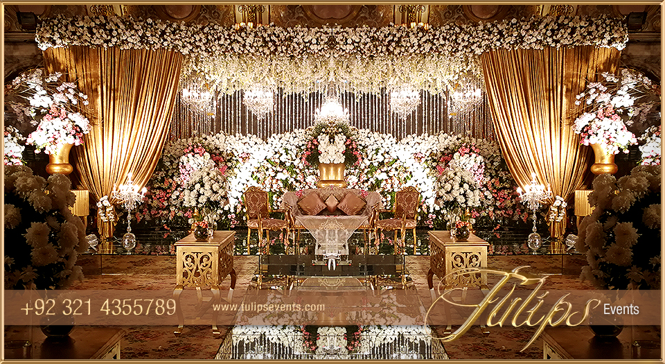 Explore another beautiful wedding with our white Gold Pakistani Reception Stage Decor setup ideas in Lahore Pakistan.